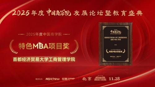 在盛典现场,MBAChina与《经理人》杂志重磅发布了多项大奖,首都经济贸易大学工商管理学院MBA项目荣获“2025年度中国商学院MBA项目TOP100”,金融MBA项目荣获“2025年度中国商学院特色MBA项目”,黄苏萍荣获“2025年度中国商学院卓越运营奖”,杨荣星、许留祥荣获“2025年度中国商学院MBA优秀校友奖”,首都经济贸易大学MBA联合会荣获“2025年度中国商学院MBA联合会金徽领航奖”,有力凸显了学院在教学革新提质、师资梯队精锐化升级、课程架构迭代完善及人才培育品质提升等方面的坚实基础与卓越综合实力。